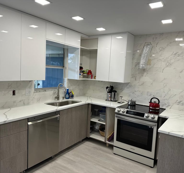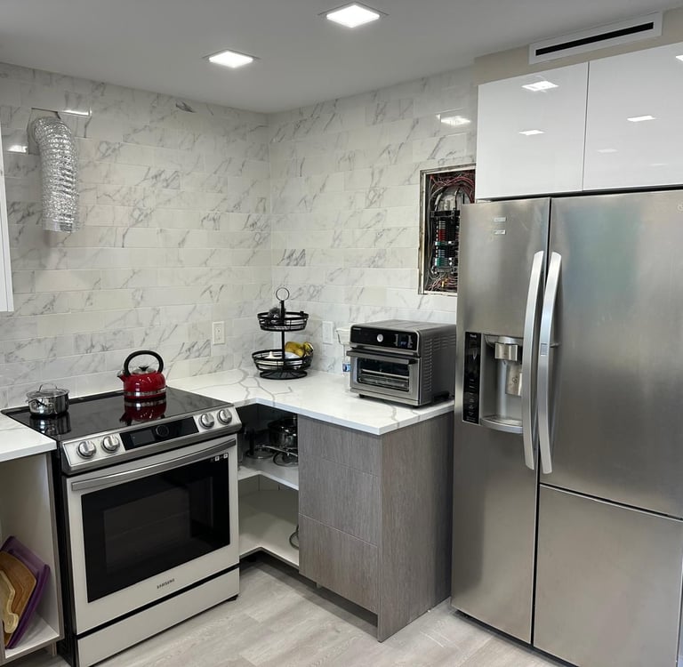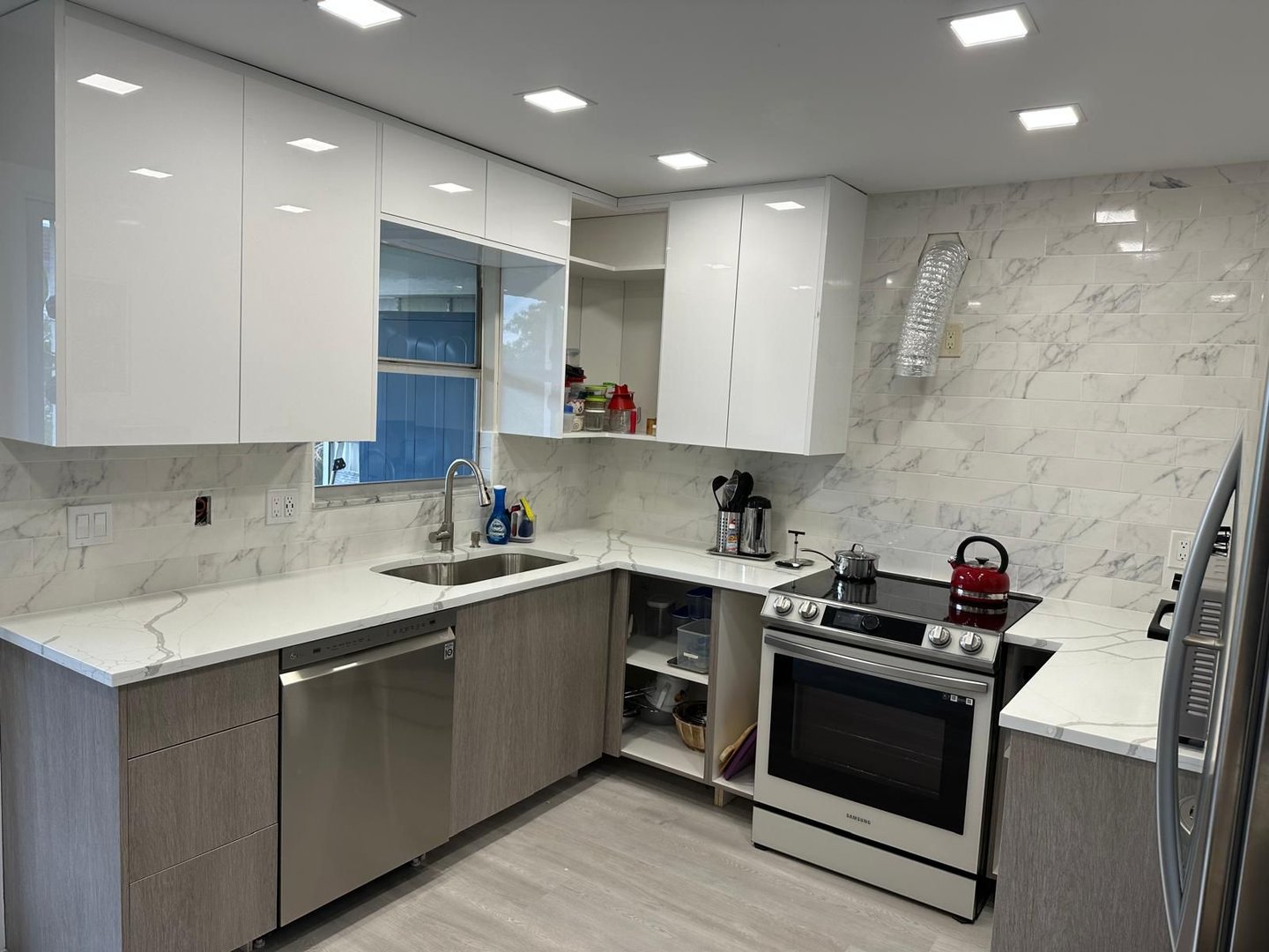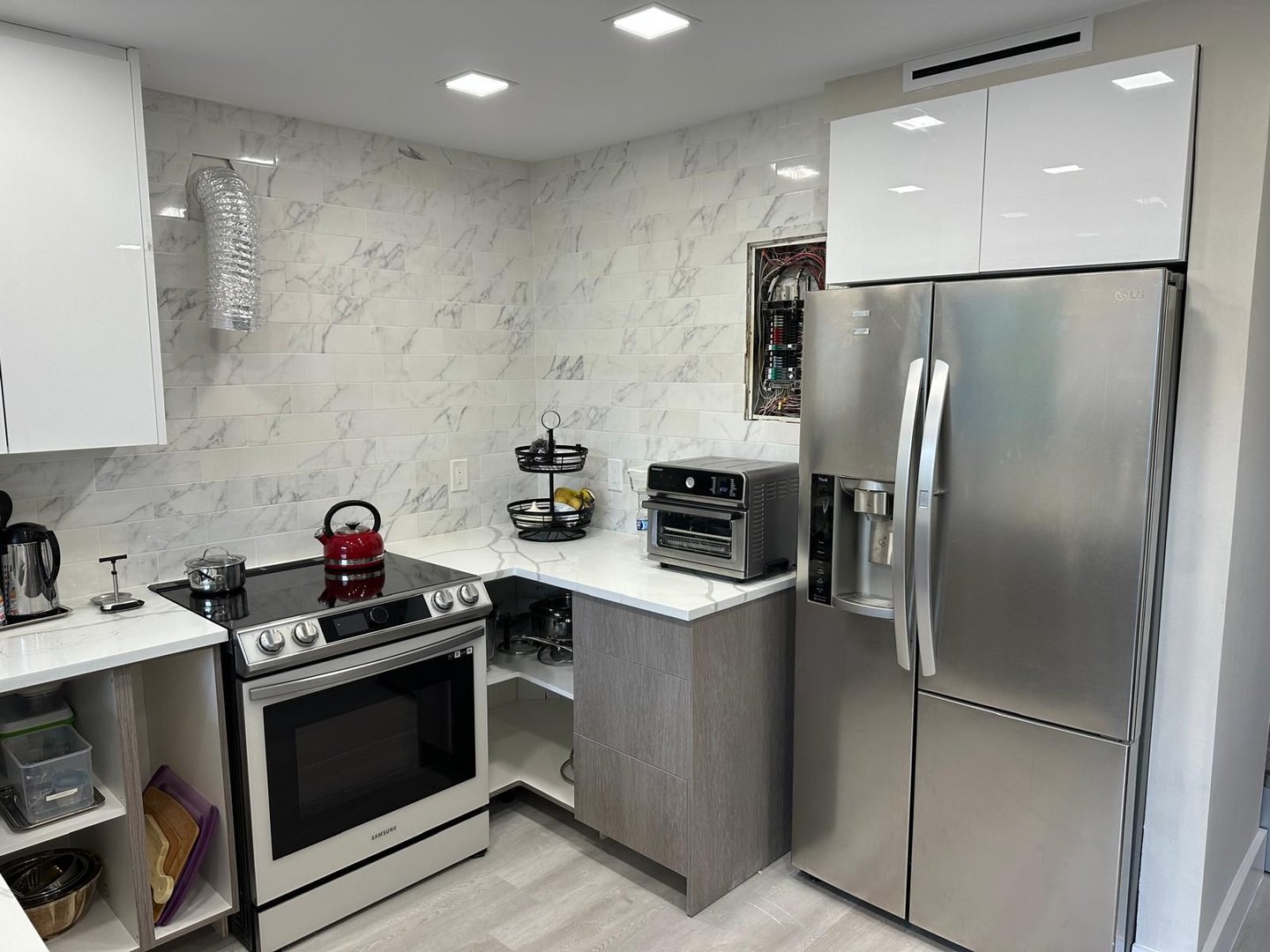 A fully remodeled kitchen with improved layout, modern finishes, and high-quality materials.