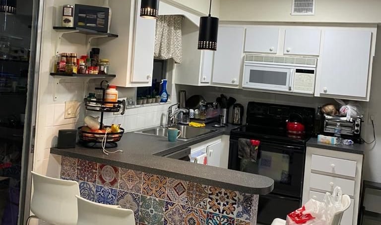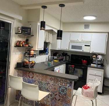 An outdated kitchen with limited functionality, worn finishes, and inefficient layout.